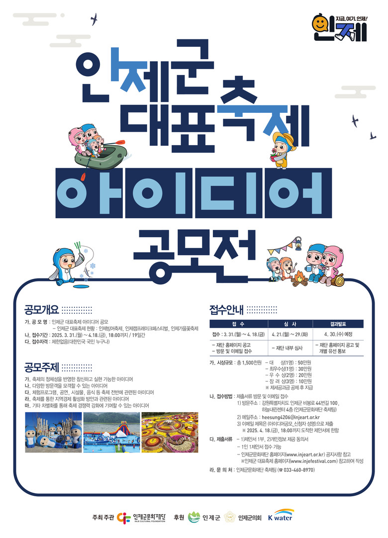 접수는 방문(인제군문화재단)과 이메일(heesung4206@injeart.or.kr)을 통해 가능하며, 공모된 아이디어는 심사를 통해 대상(50만 원) 1명, 최우수상(30만 원) 1명, 우수상(20만 원) 2명, 장려상(10만 원) 3명을 선정해 총상금 150만 원을 지급한다.