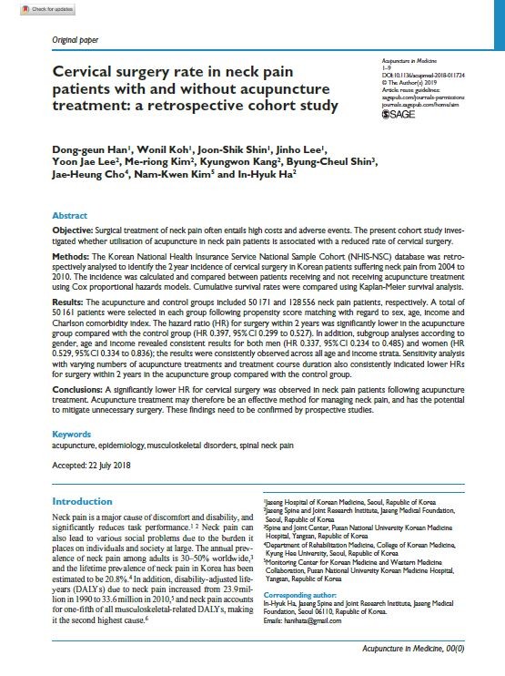 ▲‘Acupuncture in Medicine’ 8월호에 게재된 해당 연구 논문「Cervical Surgery Rate in Neck Pain Patients with and without Acupuncture Treatment: A Retrospective Cohort Study」 |