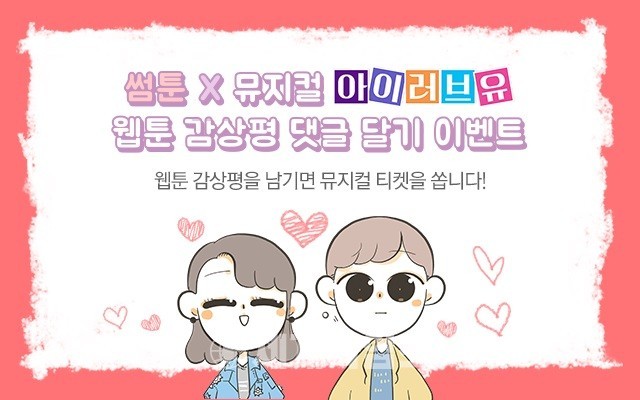 케이툰은 다음달 13일까지 케이툰 홈페이지에서 웹툰 감상 댓글 남기기 이벤트를 진행한다. 썸툰 뮤지컬 에피소드 편에 댓글을 남기면 추첨을 통해 뮤지컬 아이러브유 티켓과 썸툰 옥스포드 콜라보 상품인 두근두근 썸스틱, 스타벅스 기프티쇼 등 경품을 제공한다.