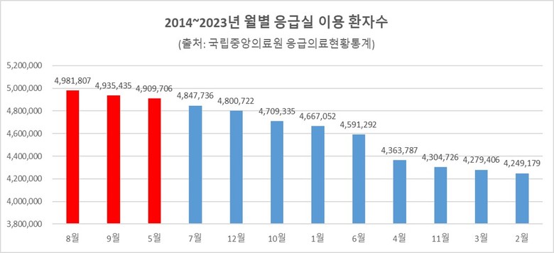 최근 10년 응급실 이용 환자수를 월별로 확인해 본 결과 8월이 498만1807명으로 가장 많았고, 9월이 두번째로 493만5435명, 5월에는 490만9706명으로, 8월, 9월, 5월 순이었다.