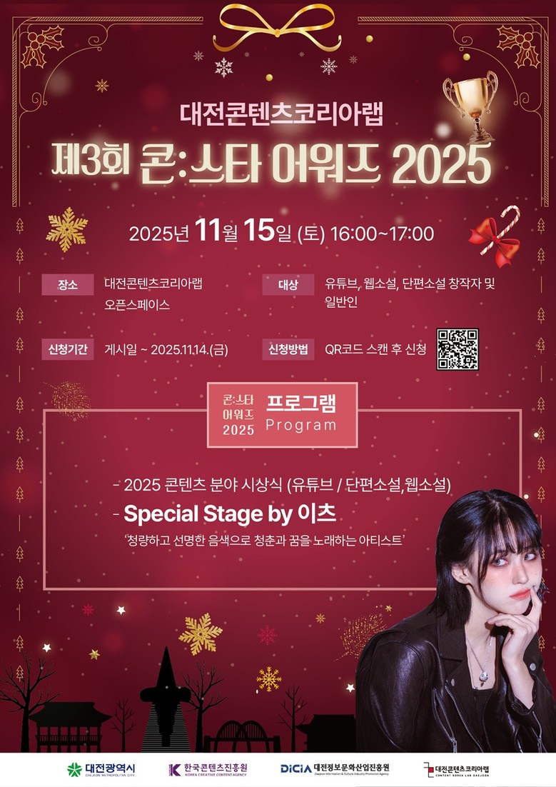 유득원 행정부시장은 “대전의 창작 인재들이 상상력과 기술을 결합해 전국적인 성과를 내고 있다”며 “앞으로도 창작 기반을 넓혀 시민이 체감하는 콘텐츠 도시로 발전하겠다”고 밝혔다. 이어 가수 ‘이츠’의 축하공연이 펼쳐지며 수상자들의 열정과 성취를 함께 기념했다.