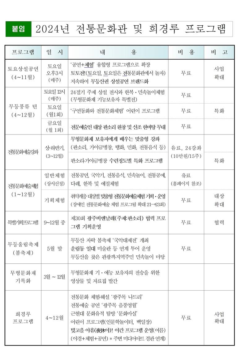 광주광역시(시장 강기정)는 무형유산 전승공간이자 전통문화예술의 산실인 ‘전통문화관’과 도심 속 전통 누각인 ‘희경루(喜慶樓)’의 2024년 운영계획을 확정했다.
