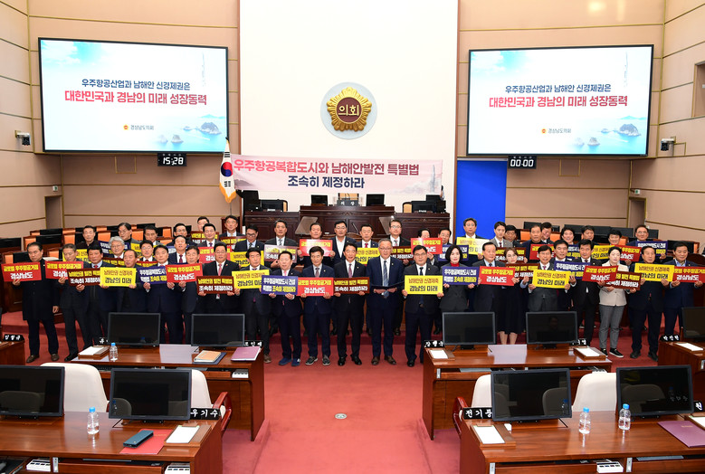 최 의장과 전체 의원들은 우주강국 건설 기반 구축과 남해안관광축 형성이 경남의 미래 성장동력 창출과 국토 균형발전을 위한 최대 현안임을 강조하고, 이를 위한 특별법 제정의 시급성을 알리기 위해 12월 13일 올해 마지막 회기 본회의 폐회 후 성명서를 발표하고 결의를 다졌다.