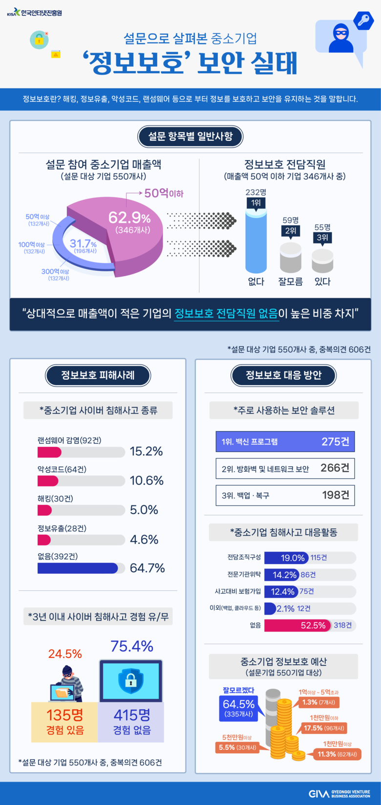 올해 조사의 경우, 총 550개 기업 중 종업원 수 50인 이하(66.4%), 매출액 50억 원 이하(62.9%)의 소규모 사업체가 과반수 이상이였으며, 주요 내용으로는 전체 기업 중 27.1%의 기업(149개)만이 정보보호 전담직원이 있다고 답변했다. 특히, 전체 기업의 62.9%를 차지하고 있는 매출액 50억 원 이하 기업 경우에는 전담직원이 없거나(67%, 232개), 잘모르겠다(17%, 59개)를 합치면 84%(291개)에 해당하였다. 이를 통해, 아직까지 지역 중소·벤처 기업 경우 정보보호에 대한 인식 및 대응수준은 낮은 것으로 파악되었다.