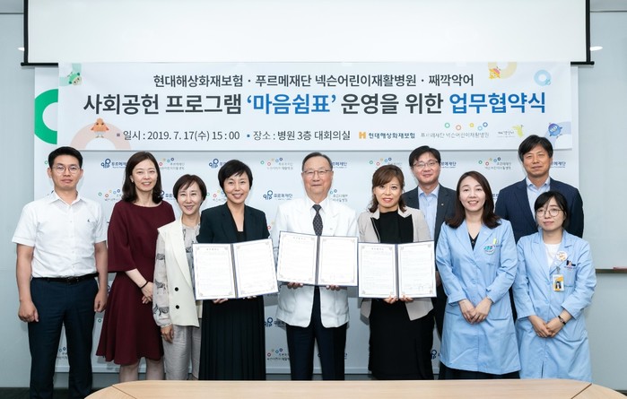 현대해상은 푸르메재단 넥슨어린이재활병원(이하 푸르메어린이재활병원)과 아동 돌봄서비스 전문기업 째깍악어㈜와 업무협약을 맺고 푸르메어린이재활병원에서 치료 중인 장애아동과 보호자를 대상으로 프로그램을 제공할 예정이다.
