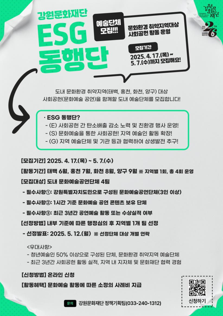 한편, < ESG 동행단 >은 강원문화재단의 ESG경영에 맞춰 △ [E] 사회공헌 간 탄소배출 감소 노력과 친환경 행사 운영 △ [S] 지역 예술인의 활동 확장과 사회공헌 △ [G] 지역 예술단체 및 기관 등과 협력한 상생발전 등 ESG 실천 중심으로 운영될 예정이다.