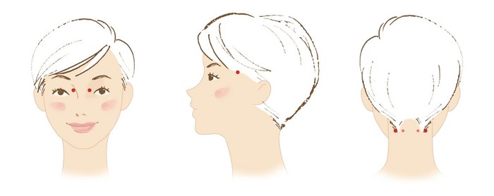 | ▲노안 진행을 늦추는데 도움이 되는 지압 위치. 왼쪽부터 정명혈, 태양혈, 풍지혈 |