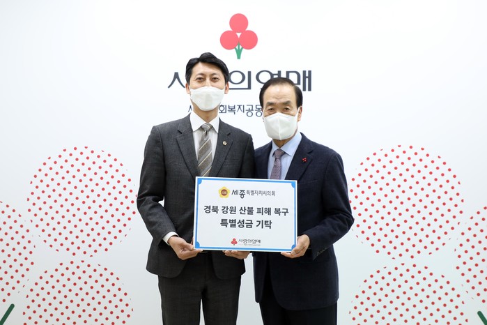 [세종=세계타임즈 이채봉 기자] 세종특별자치시의회(의장 이태환)는 16일 대형 산불로 큰 피해를 입은 강원도와 경북 지역 주민들의 조속한 일상 회복을 기원하며 세종사회복지공동모금회(회장 홍영섭)에 성금을 기탁했다.
