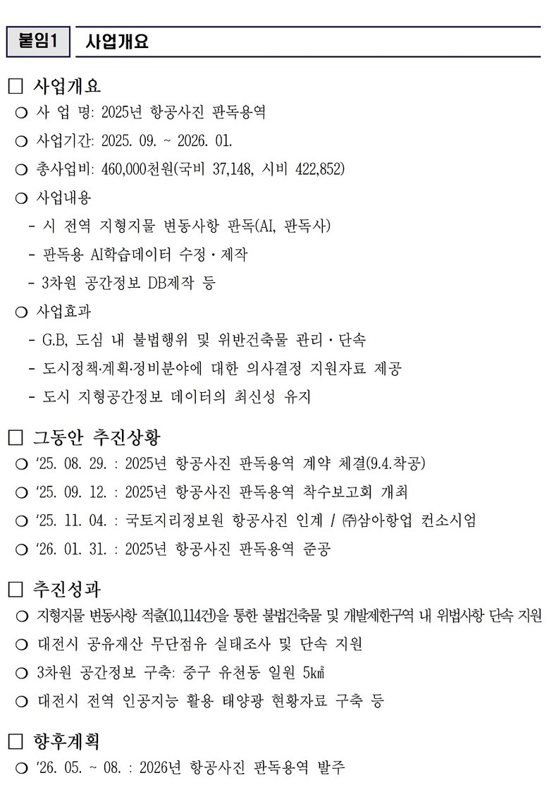 대전시 관계자는“항공사진과 인공지능 기술을 접목한 스마트 도시관리 체계를 지속적으로 고도화해 시민이 체감할 수 있는 안전하고 쾌적한 도시환경 조성에 최선을 다하겠다”라고 말했다.