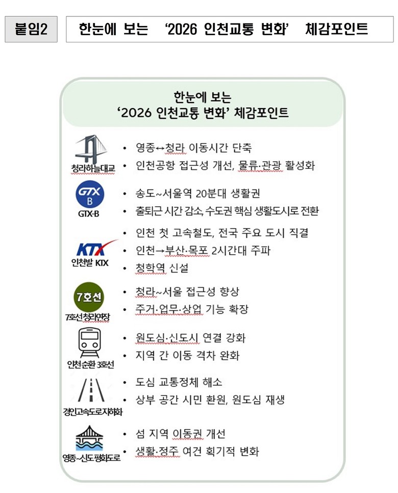 인천시가 2026년을 기점으로 추진하는 교통 혁신은 ‘더 빠른 이동’ 그 이상의 의미가 있다. 원도심과 신도시, 공항과 내륙, 수도권과 전국을 촘촘히 연결해 균형발전과 삶의 질을 동시에 끌어올리는 구조적 변화를 목표로 한다.