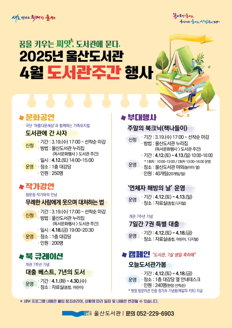 4월 도서관 주간 행사는 3월 19일 오후 5시부터 울산도서관 누리집(library.ulsan.go.kr)을 통해 신청할 수 있으며, 자세한 사항은 울산도서관 누리집 공지사항을 참고하거나 울산도서관 자료정책과(☎229-6903)로 문의하면 된다.