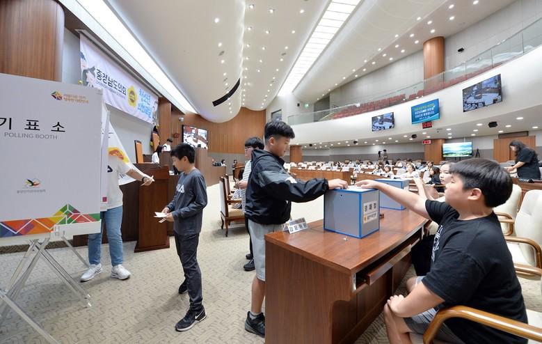 이날 학생들은 ‘책 읽기를 생활화하자’, ‘강아지를 유기하지 말자’는 내용으로 2분 발언을 진행하고, ‘교내 휴대전화 사용에 관한 조례안’과 ‘등교 시간을 늦추는 것에 관한 조례안’ 2건을 발의했다. 이들은 조례안 처리 과정에서 찬·반 토론을 통해 의견을 개진하고, 도민들을 위한 정책이 만들어지는 과정을 배웠다.