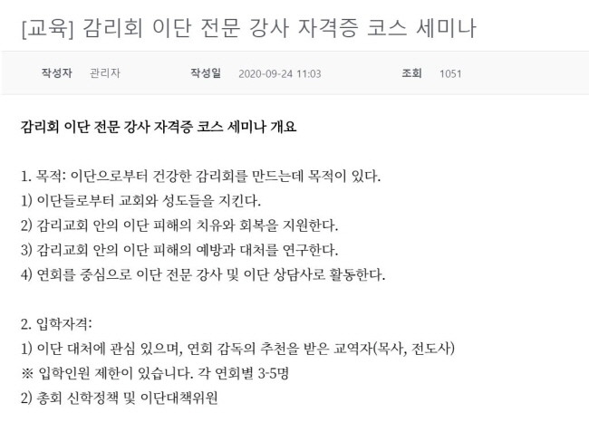 이어 “코로나19 사태 이후 신천지 등 이단 문제가 심각하게 대두됐다”며 “고로 이단 문제 방지를 위해 이번 기회에 교단에서 마련한 교육”이라고 강조했다.