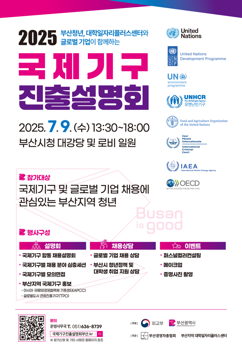 또한, 시는 이번 행사에 ▲부산 지역 국제기구(APCC, TPO) 홍보관 ▲시 청년정책 및 대학생 취업 지원 상담 공간(부스) 등을 운영해 청년들의 취업에 도움이 될 기회를 제공한다.