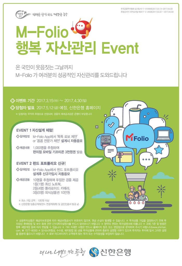 이번 이벤트 기간 동안 M-Folio의 ‘똑똑 로보 제안’이나 ‘꼼꼼 전문가 제안’을 이용해 포트폴리오 설계를 체험하면 추첨을 통해 1,000명의 고객에게 편의점 모바일 기프티콘 3천원권을 제공한다.