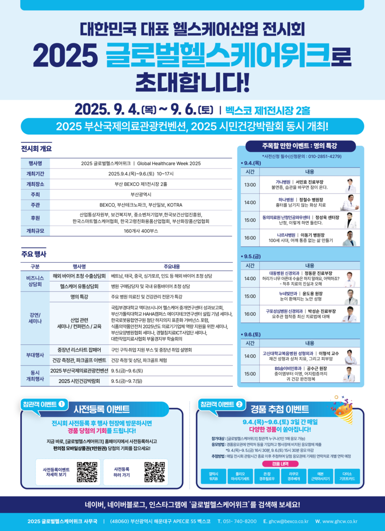 특히, 올해는 「2025 부산국제의료관광컨벤션」과 「2025 시민건강박람회」도 함께 열려, 관련 전시회를 한자리에서 관람할 수 있는 것이 특징이다.