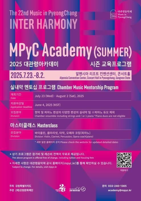 모집 대상은 중학생 이상 음악 전공자이며, 5월 22일(목)부터 6월 19일(목)까지 대관령음악제 홈페이지(mpyc.kr)에서 지원할 수 있다. 사전 심사를 통해 선발할 예정이며, 선발된 학생들은 참가비 및 수업료 전액이 지원된다. 일반인 청강이 가능한 오픈 마스터클래스(유료)로 진행될 예정이다.