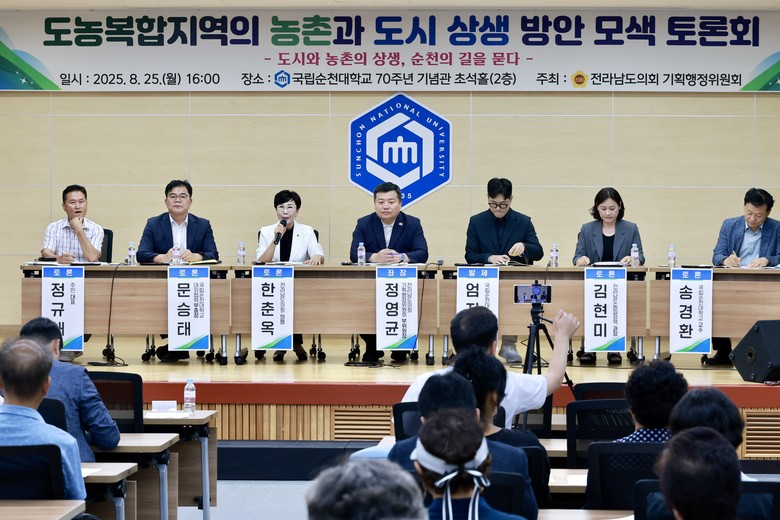 [전남 세계타임즈=우덕현 기자] 전라남도의회 한춘옥 의원(더불어민주당, 순천2)은 지난 25일 순천대학교 70주년 기념관 초석홀에서 열린 「도농복합지역의 농촌과 도시 상생 방안 모색 토론회」에 참여했다.