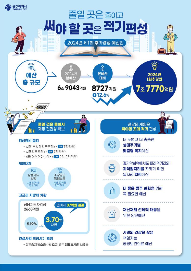 - 촘촘한 복지·일자리·안전 등 ‘더 좋은 광주’ 실현 예산 반영 [광주 세계타임즈=손권일 기자] 광주광역시(시장 강기정)는 2024년도 제1회 추가경정예산안 8727억원을 편성해 18일 광주광역시의회에 제출했다.