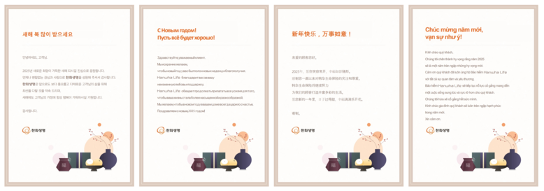 한화생명은 다국어 연하장에 앞서 고객 안내장과 영업지원시스템 등에 다국어 서비스를 지원하며 고객 접근성을 극대화해 나가고 있다. 지난해 6월 중국어를 시작으로 현재 베트남어, 러시아어까지 지원 언어를 늘렸다.