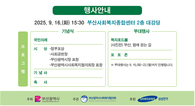 시는 정부보다 앞선 1994년부터 9월을 ‘부산복지의 달’로 지정하고 32회째 기념식을 이어오고 있으며, 2003년부터 ‘사회복지의 날’도 함께 기념한다.