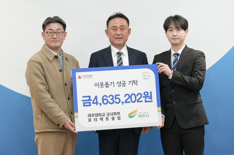 [여주시 세계타임즈=송민수 기자] 지난 23일 여주대학교 군사학부 로타랙트클럽(회장 장경록, 지도교수 한재우)에서는 여주시청(시장 이충우)을 방문하여 이웃돕기 성금 463만원을 기탁하였다.