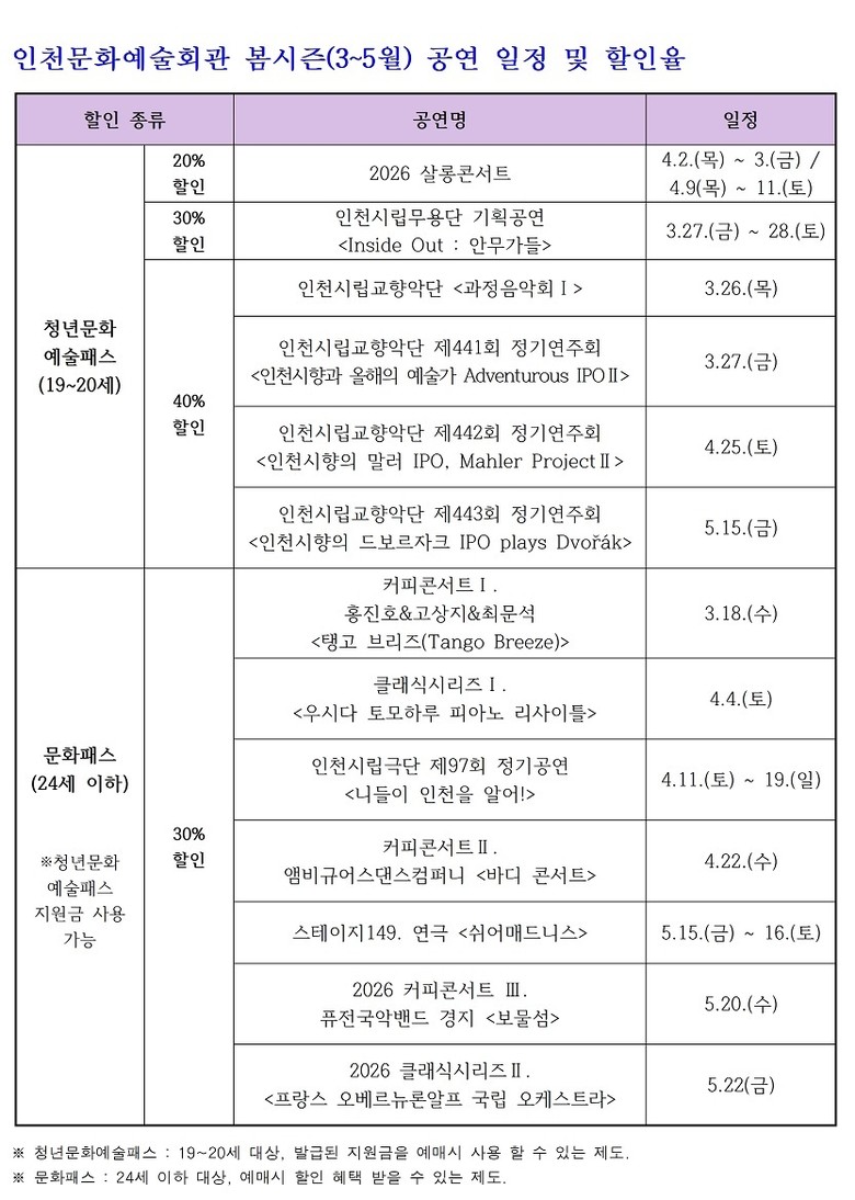 회관은 이번 봄 시즌 총 13개 공연에 대해 공연별로 20%에서 최대 40%까지 할인 혜택을 제공한다. 상세 할인율과 예매 방법은 인천문화예술회관 누리집을 통해 확인할 수 있다