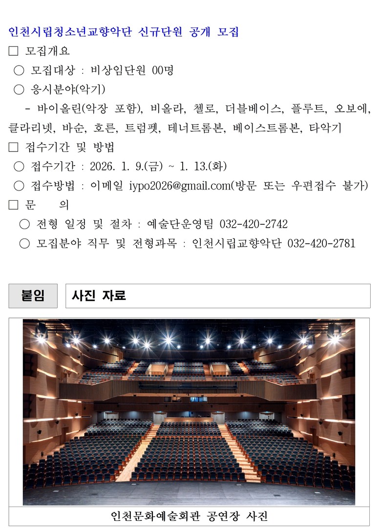 모집과 관련된 세부 내용은 인천광역시 누리집 내 고시공고 또는 인천문화예술회관 누리집 내 새소식 게시판을 통해 확인 가능하다. ▲전형일정 및 절차는 예술단운영팀(032-420-2742), ▲모집분야 직무 및 전형 과목 은 인천시립교향악단(032-420-2781)으로 문의 할 수 있다.