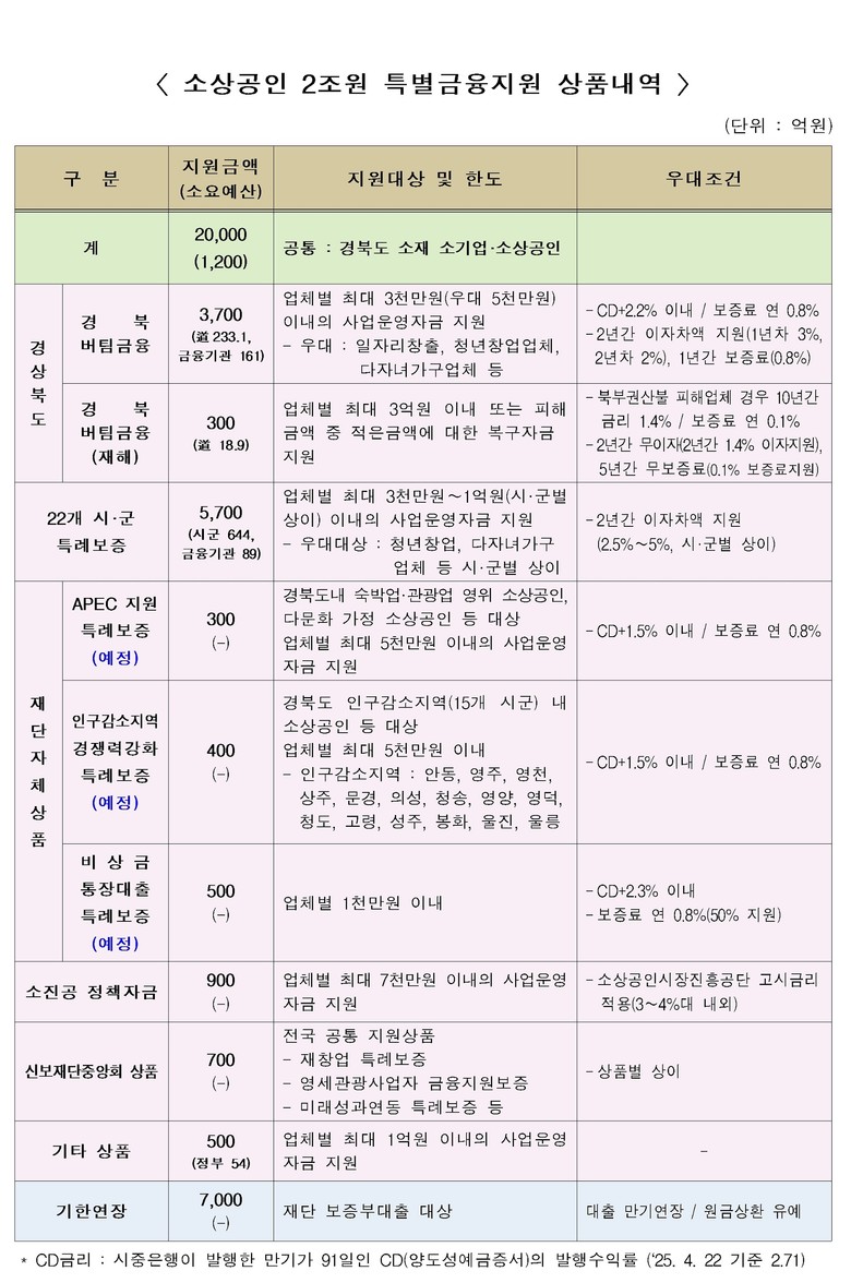 특별금융지원 사업 세부 내역으로는 ▴경북버팀금융(道 자체 소상공인 금융지원 사업) 4,000억원 ▴시군 소상공인 특례보증 5,700억원 ▴APEC 정상회의 성공개최 지원 특례보증 300억원 ▴경북 인구감소지역 경쟁력 강화 특례보증 400억원 ▴경북 소상공인 비상금 통장대출 특례보증 500억원 ▴소상공인시장진흥공단 정책자금 900억원 ▴기타자금 1,200억원 등 신규 지원 1조 3천억원과 만기 연장 7천억원을 포함해 총 2조원 규모다.