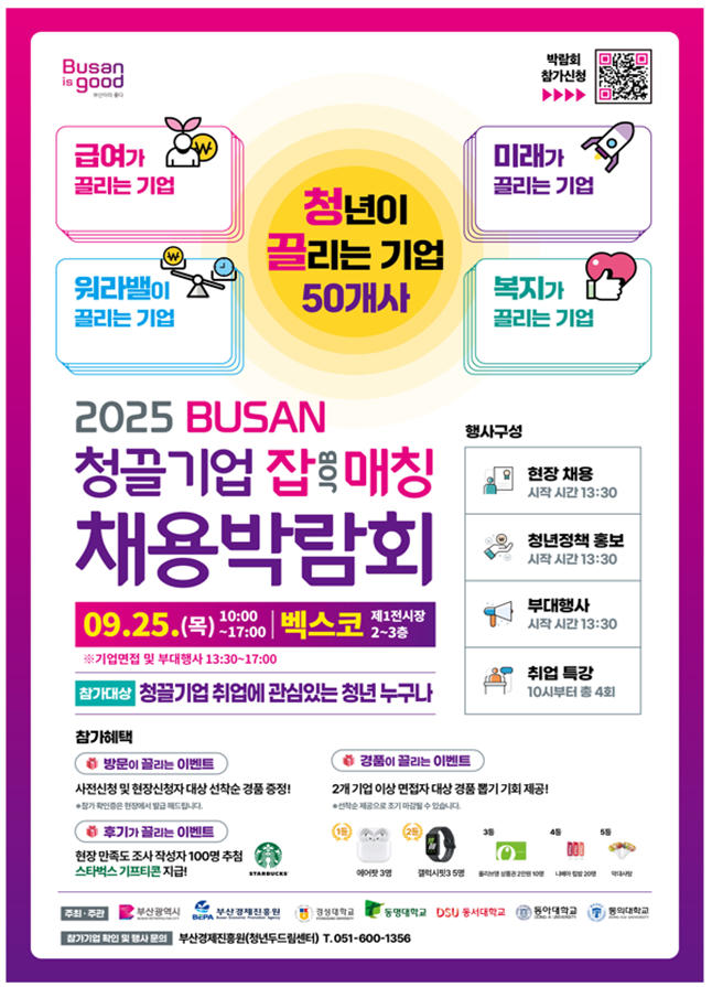 한편, 시는 청년고용우수기업 수여식에 이어 오는 9월 25일 오후 1시 30분 벡스코 컨벤션홀 2~3층에서 「2025 청끌기업 잡(JOB) 매칭 채용박람회」를 개최한다.