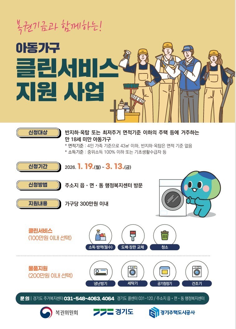 선정된 가구는 경기도 주거복지센터에서 최대 300만원 한도에서 클린서비스(▲소독·방역) ▲장판 교체 ▲수납 정리 ▲청소와 물품(▲냉난방기 ▲세탁기 ▲공기청정기 ▲건조기)을 지원받을 수 있다. 용인특례시의 경우 올해 총 15가구가 지원 대상으로 선정할 계획이다.
