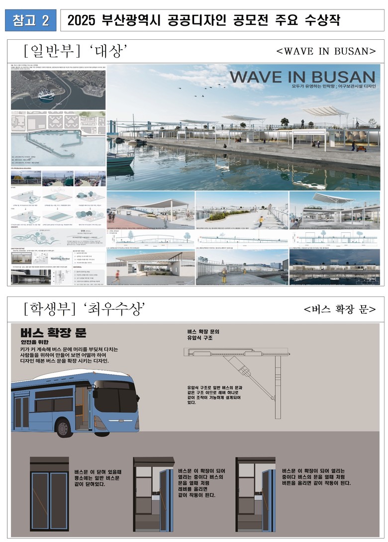 한편, 우수 디자인으로 선정된 30점의 작품은 오는 9월 24일 시민공원 다솜갤러리에서 열리는 「2025 부산사인엑스포」 내 부산 공공디자인 홍보관에 전시되며, 연내 작품집으로 제작해 배부할 예정이다.