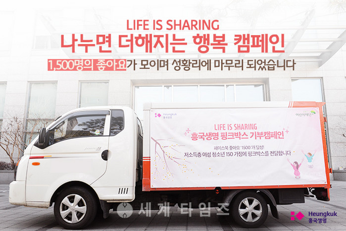 [세계타임즈 김장수 기자] 태광그룹 금융 계열사인 흥국생명은 지난 14일, 150개의 ‘핑크박스’를 금천구의 취약계층 여성 청소년에게 전달했다. 초록우산어린이재단과 함께 진행했던 ‘핑크박스’ 캠페인에 네티즌들이 총 1,500번의 ‘좋아요’ 버튼을 클릭한 높은 호응의 성과다.