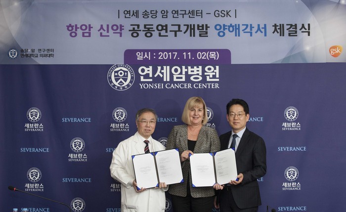 이날 연세암병원에서 진행된 체결식에는 송당 암연구센터의 정현철 센터장을 비롯해 GSK 한국법인 의학개발부 총괄 이일섭 부사장 및 GSK 본사의 캐시 루안(Kathy Rouan) R&D 부문 부사장이 참석해 파트너십을 다졌다.