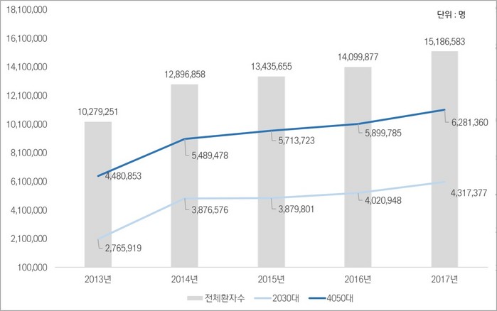 건강보험심사평가원 보건의료빅데이터에 따르면 치주 질환은 2013년 1027만 9251명에서 2017년 1518만 6583명으로 약 67.7% 증가한 것으로 나타났다. 치과 질환 중 유병률 1위를 차지하고 있는 치주질환 환자수는 매년 꾸준히 증가해왔다. 연령별로 보면 2017년 기준 4050대가 전체 환자 수의 약 41%을 차지하고 있는데 특히, 2030대 환자수가 2013년 276만5919명에서 2017년 431만 7377명으로 64% 가량 증가한 것은 주목할 부분이다.