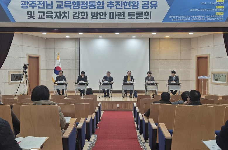 이번 토론회에는 시교육청과 광주시민단체협의회, 광주교육시민연대, 광주참교육학부모회, 전교조광주지부, 광주교사노동조합 등 민·관 교육단체가 참여해 행정통합에 따른 교육 자치권 수호 방안을 논의했다.
