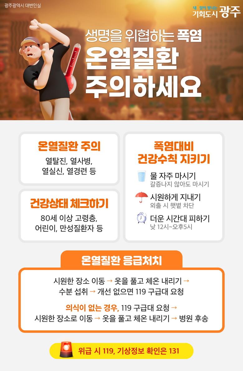 광주광역시(시장 강기정)는 지난 5월 20일부터 온열질환자를 관리하기 위해 응급실 운영 의료기관 26곳을 통해 온열질환자 발생 현황을 확인하는 ‘온열질환 응급실 감시체계’를 운영하고 있다.