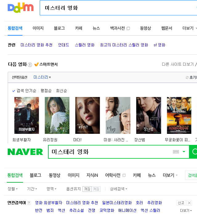 네이버에 따르면 '미스테리 영화' 검색 시 연관검색어 중 첫 번째는 '영화 희생부활자', 두 번째는 '미스테리 영화 추천', 세 번째는 '일본미스테리영화'가 노출됐다.