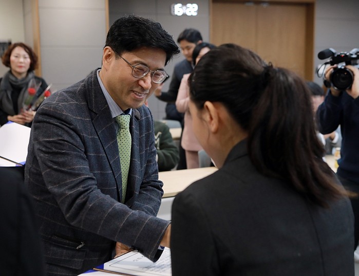 | ▲자생의료재단 신민식 사회공헌위원장이 한 장학생에게 장학증서를 전달하고 있다. |