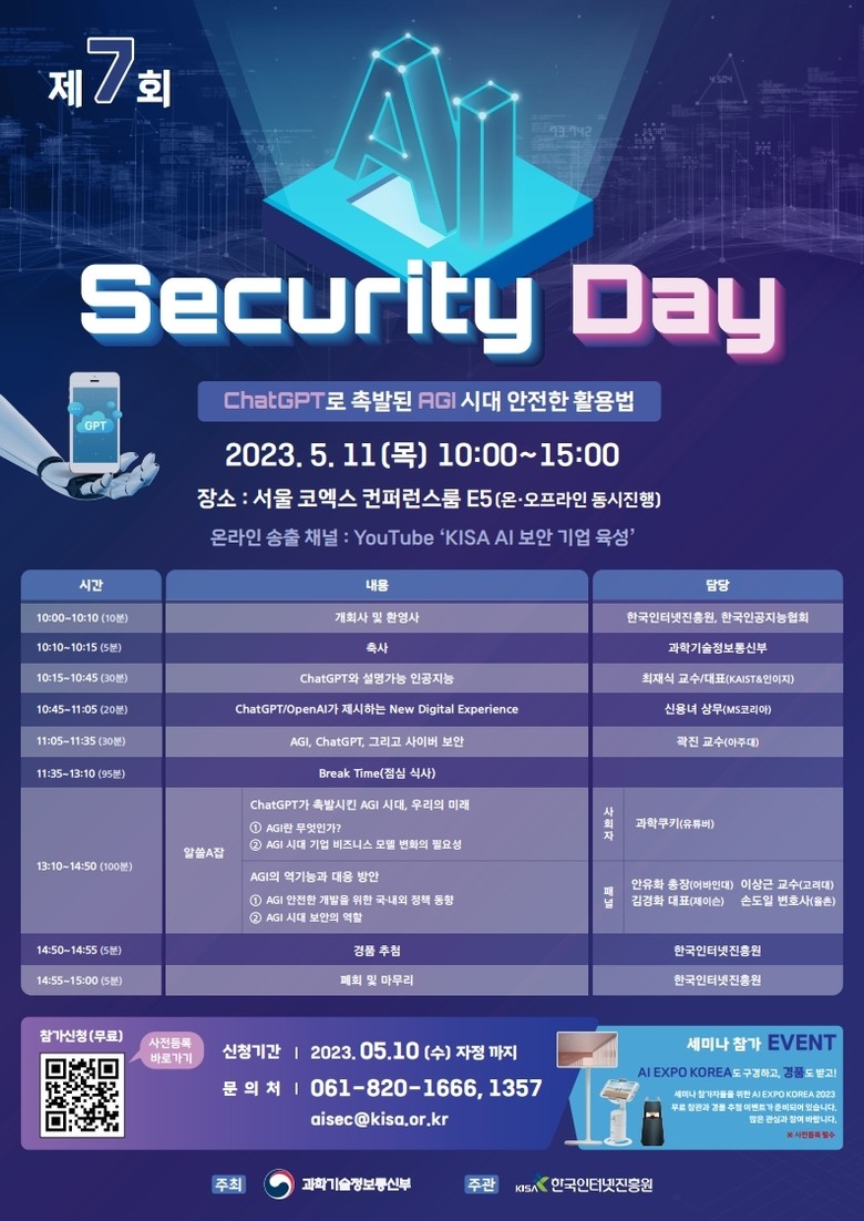 [세계타임즈 백진욱 기자] 한국인터넷진흥원(KISA, 원장 이원태)과 과학기술정보통신부(장관 이종호)가 다가오는 2023. 5. 11.(목)에 우리의 삶 속으로 빠르게 다가오고 있는 범용인공지능(AGI) 환경에 대해 살펴보고, 관련된 다양한 위협사례 공유 및 대응방안을 논의하기 위한 ‘제7회 AI Security Day 세미나’를 서울 코엑스와 온라인에서 동시 개최한다고 밝혔다.최근 Chat-GPT와 같은 대화형 인공지능의 획기적인 발전으로 인공지능과 실생활이 밀접해지면서 인공지능에 대한 수요와 관심이 급증하고 있다. 이에 따라, 인공지능 기반 사이버 보안, 역기능 대응 및 정책·윤리에 대한 산업계의 역할과 책임 또한 주목받고 있다.