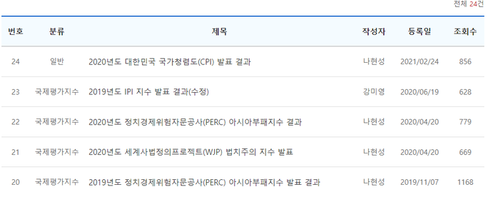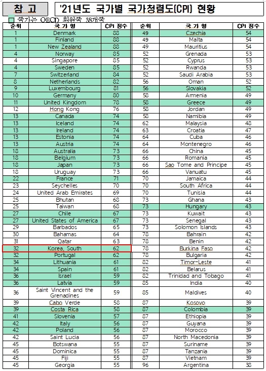 만 발표하고 이미 국제투명성기구(TI, Transparency International)가 지난 25일 발표한 2021년도 국가청렴도(CPI, Corruption Perceptions Index, 이하 CPI)를 발표하지 아니하였다.