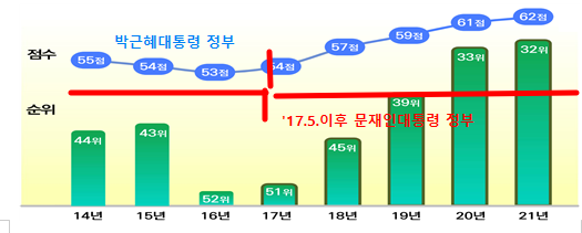 이 점수는 역대 최고 점수이며 , 현 정부 출범 이래 최근 5년 동안 OECD 국가 중 점수(8점)・순위(19단계) 상승 폭 가장 높은 점수를 기록 하였다.아(‘22.1.25)