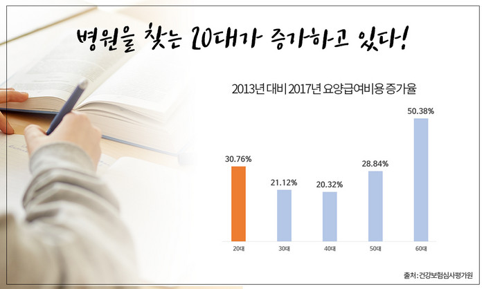 국민건강보험심사평가원의 진료비 통계지표자료에 따르면 연령별 요양급여비용 증감률에서 20대의 증가율이 60세 이상을 제외하고 가장 크게 증가한 것으로 나타났다. 2016년 연간통계에서는 20대 증가율이 30.8%로 30대 21.1%, 40대 20.3%, 50대 26.8%보다도 높은 수치를 기록했다. 2017년 상반기 진료비 통계지표자료에서도 같은 결과를 보였다. 요양급여 비용의 증가는 그 연령 대의 병원 이용 빈도 및 의료비 지출이 늘어났다는 것으로, ‘병원에 가야 하는 상황이 많아졌다’는 것을 의미한다.