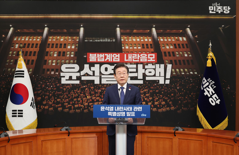 이 대표는 이날 국회에서 '윤석열 내란 사태 관련 특별 성명'을 발표하고 "민주주의 선진국인 대한민국이 심각한 위기에 봉착했다. 충격적인 것은 이 모든 문제가 윤 대통령으로부터 시작됐다는 것"이라고 말했다.