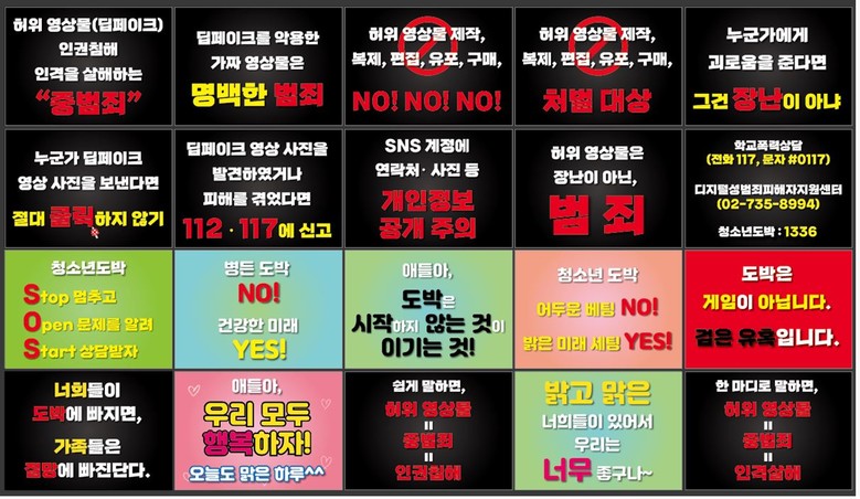 캠페인의 주요 내용은 ▶허위 영상물 제작(소지·유포·시청)의 범죄행위 ▶SNS 계정에 개인정보공개 주의 ▶딥페이크 영상물 신고 방법 및 대처방안 등이며, 더불어 청소년 도박중독예방도 함께 담았다.