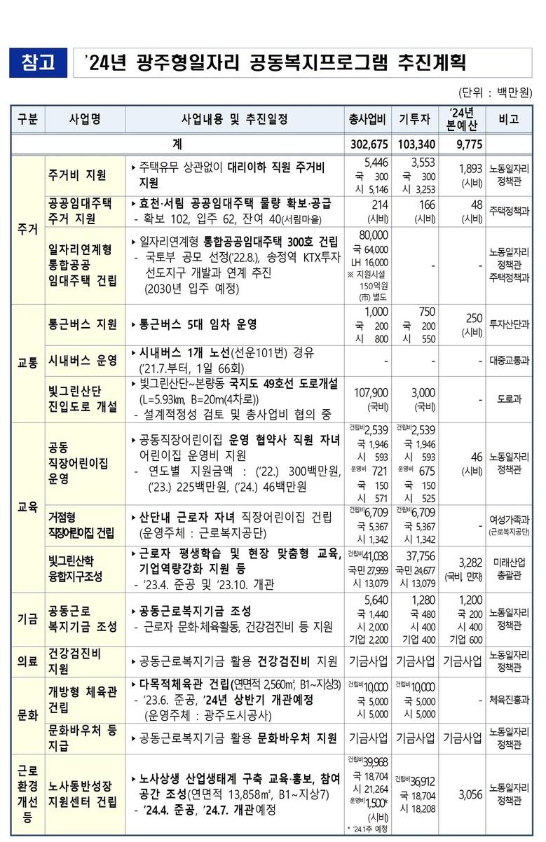 광주시는 그동안 공동복지프로그램을 통해 주거비 지원, 효천‧서림 공공임대주택 입주 지원, 통근‧시내버스 운영, 산단내 어린이집 운영 등 14개 사업에 1029억원을 투입했다.