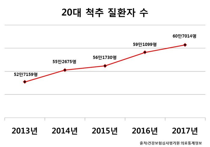 | ▲20대 척추질환 환자 수(2013~2017년) |