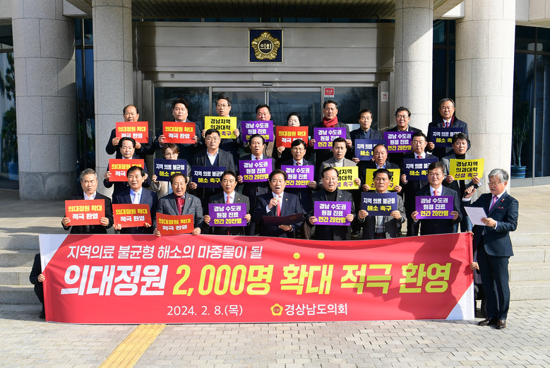 [경남 세계타임즈=최성룡 기자] 경상남도의회 김진부 의장을 비롯한 의원 일동은 2월 8일 도의회 현관 앞에서 지난 6일 보건복지부의 ‘2025학년도 의과대학 정원 2,000명 확대’ 발표와 관련해 적극 환영의 뜻을 전하고 의대 정원 확대만으로는 해소할 수 없는 지역 내 의료인력 불균형 문제 해결을 위해 조속히 경남지역 내 의과대학을 신설해 줄 것을 정부에 촉구하는 성명서를 발표하였다.