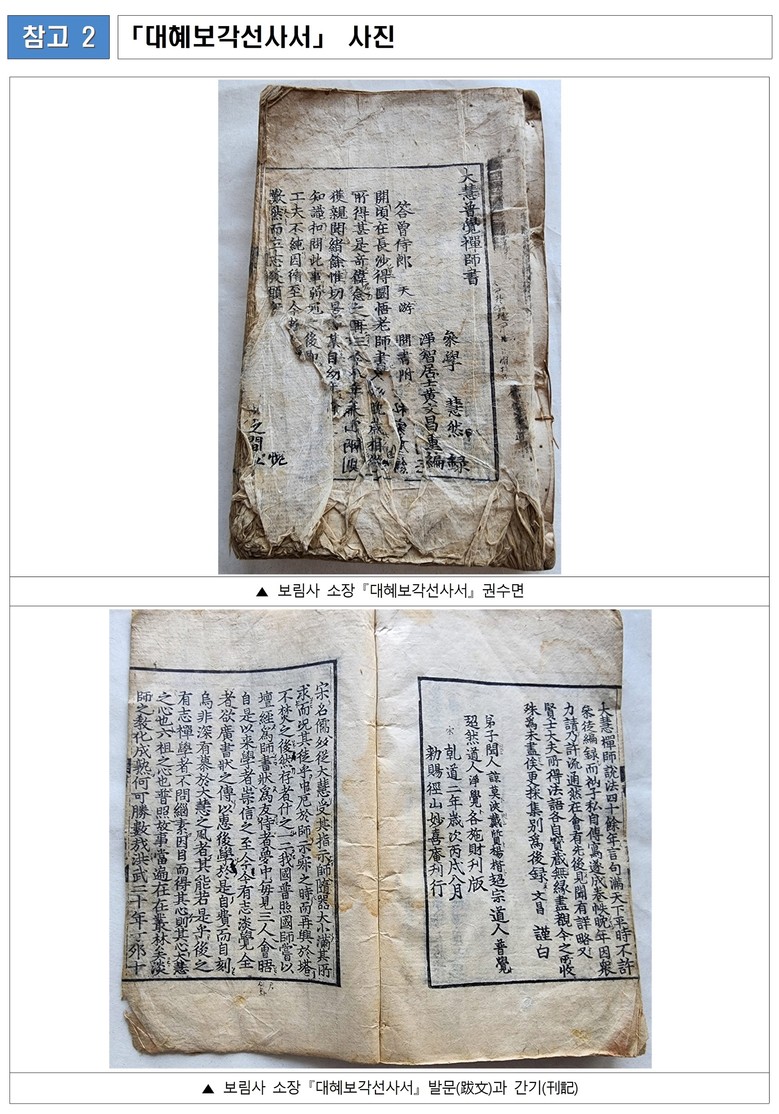 또한, 오늘(26일)자로 시문화유산 자료로 신규 지정된 보림사 소장 「대혜보각선사서(大慧普覺禪師書)」는 1574년 황해도 문화 구월산 월정사에서 간행된 목판본이다. 임진왜란 이전에 간행된 불서로서 중국 불서의 전래와 수용과정을 보여주는 한국 불교사와 서지학* 연구에 중요한 자료다.