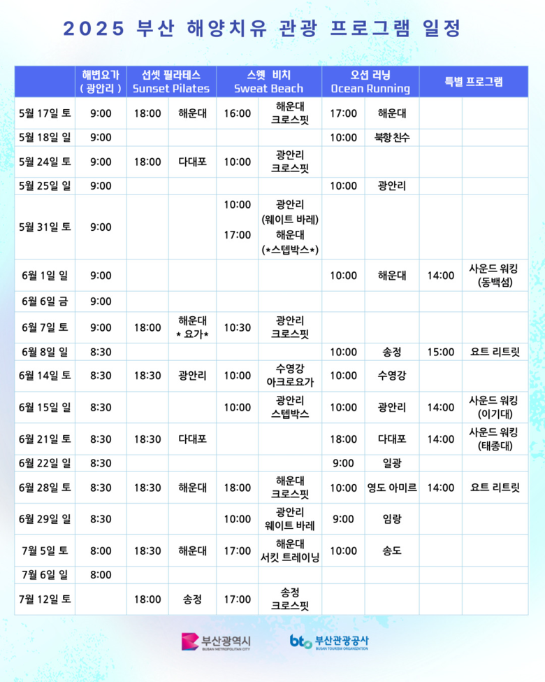 김현재 시 관광마이스국장은 “부산의 바다에서 몸과 마음을 회복할 수 있는 다양하고 질 높은 프로그램을 준비했다”라며, “부산을 찾은 많은 관광객이 치유와 즐거움을 동시에 누릴 수 있는 시간이 되길 바란다”라고 전했다.